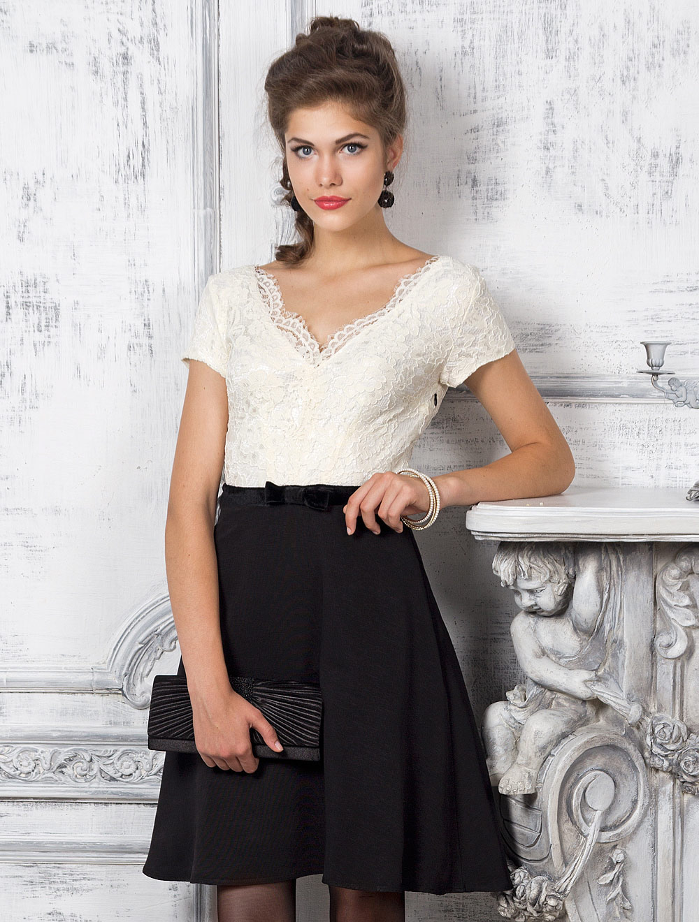 Описание: Верхняя часть платья выполнена из кружева на подкладке. На талии декоративный бант-пояс и бархатной ленты. Подкладка юбки дополнена воланом с сеткой. Потайная молния в боковом шве.В больших размерах длина платья до колена.