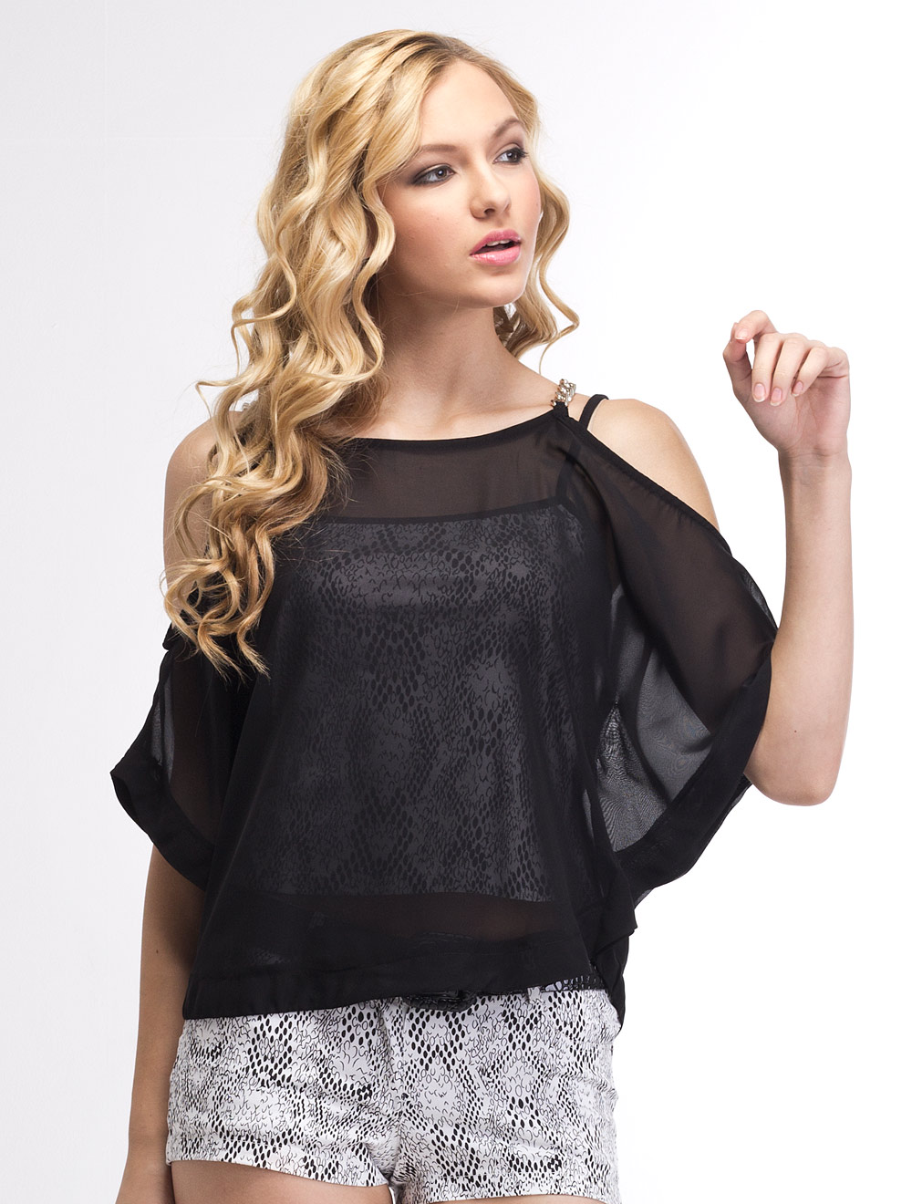 Описание: Модель состоит из двух частей. Внутренний топ на тонких черных бретелях из трикотажа с принтом под кожу питона; а также верхняя блуза из тонкого прозрачного шифона. Бретели шифонового топа предстявляют собой крупные цепи серебристого цвета.