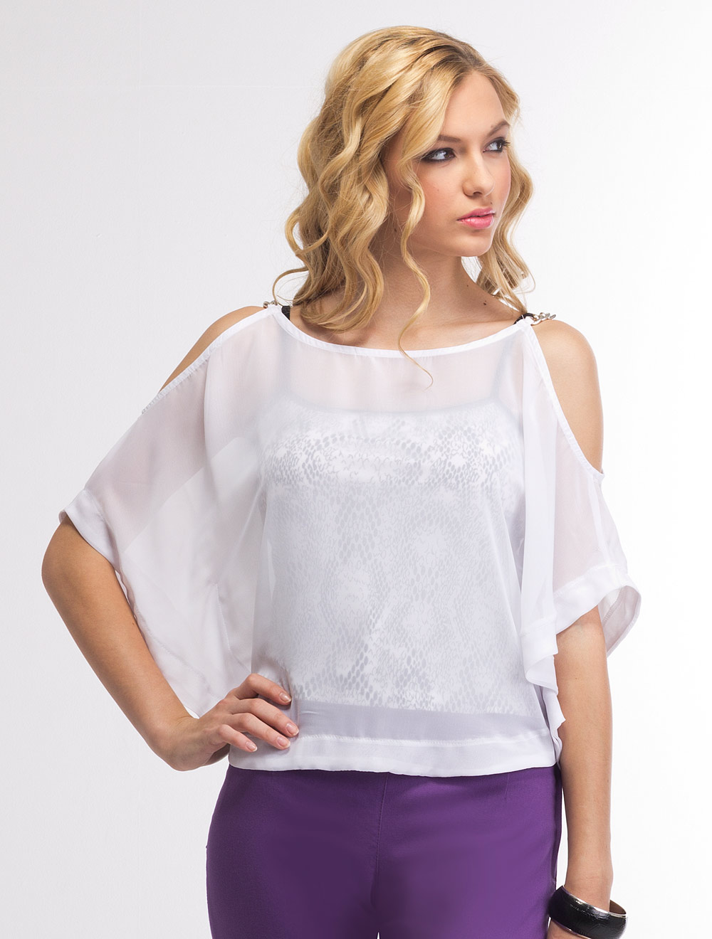 Описание: Модель состоит из двух частей. Внутренний топ на тонких черных бретелях из трикотажа с принтом под кожу питона; а также верхняя блуза из тонкого прозрачного шифона. Бретели шифонового топа предстявляют собой крупные цепи серебристого цвета.