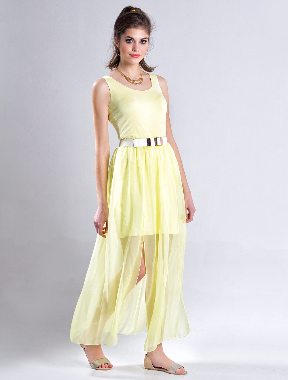 Описание: Верхняя часть и подкладка из тонкого эластичного трикотажа. Юбка, на сборке у линии талии, выполнена из тончайшей мягкой шифоновой органзы, напоминающей натуральный шелк. Шик платью придает не только прозрачность юбки, но и длинные разрезы на юбке до уровня короткой подкладки юбки.