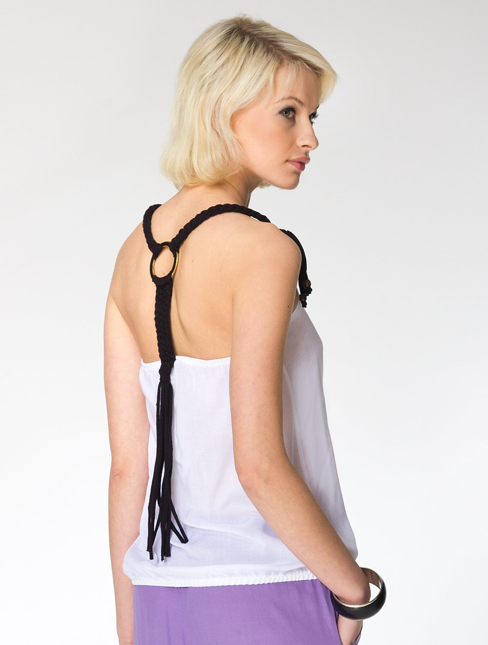 Описание: Мягкая вискоза. Декоративные бретели сплетены из трикотажа, соединяются на спинке в широкую плетеную тесьму и заканчиваются длинной бахромой с деревянными бусинами. Положение бретели регулируется по высоте на кнопках для выбора лучшей посадки. Линия верхнего среза и низ на резинке.