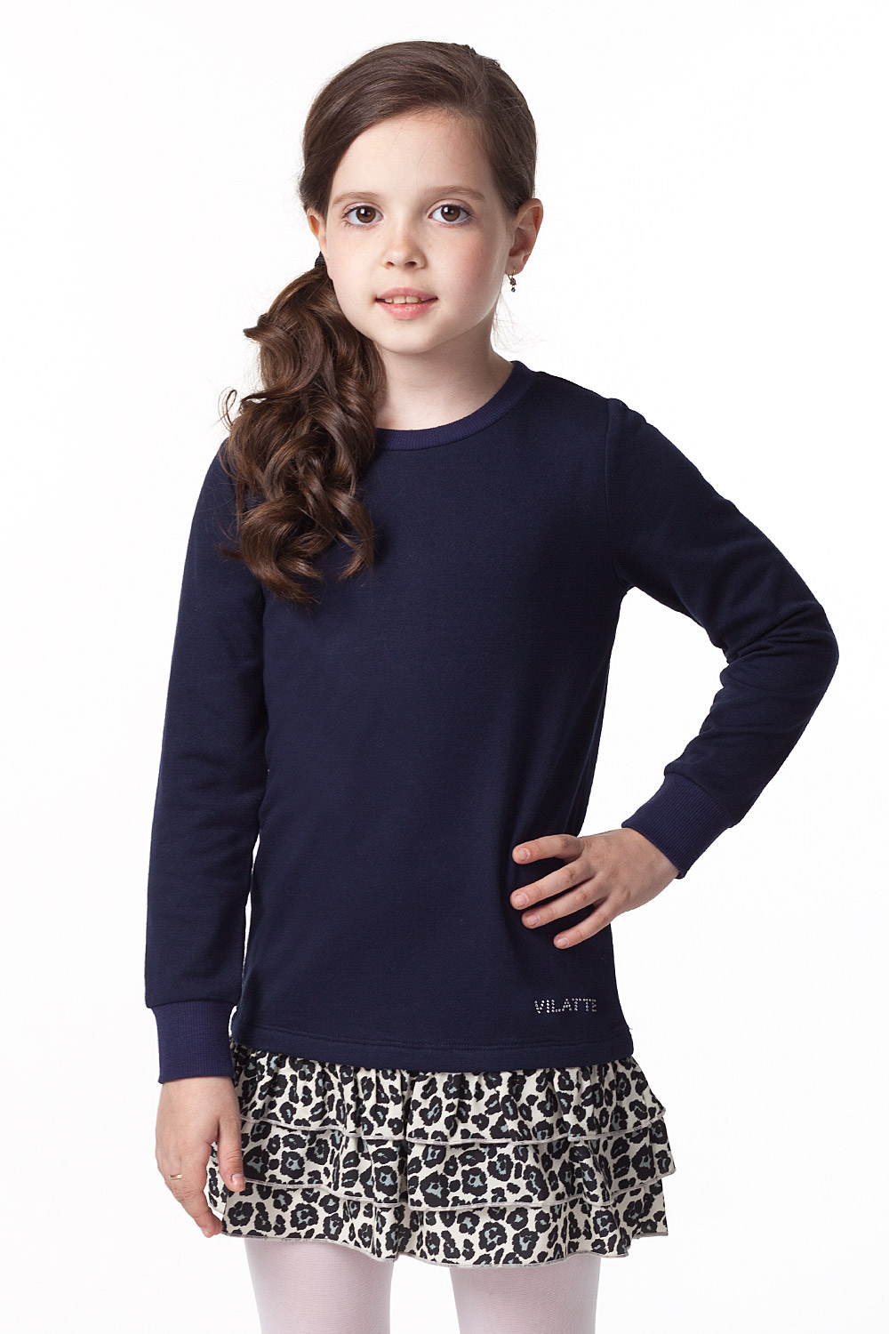 Платье из футера с оборкой из вискозной ткани с принтом. Низ изделия декорирован аппликацией из стразов.