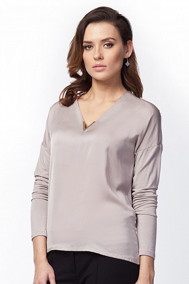 Элегантная блузка с V-образным вырезом, акцентированным золотой фурниурой в виде буквы "V". Передняя часть выполнена из гладкого полуглянцевого полотна, спинка и рукава - трикотажные.