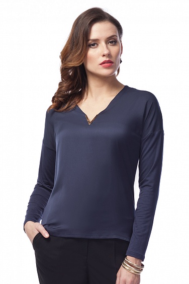 Элегантная блузка с V-образным вырезом, акцентированным золотой фурниурой в виде буквы "V". Передняя часть выполнена из гладкого полуглянцевого полотна, спинка и рукава - трикотажные.