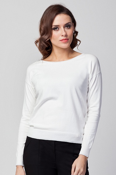 Джемпер тонкой вязки с длинным рукавом и широкими манжетами. Край горловины и манжет вывязан нитями с люрексом, на спинке романтичный вырез - капелька.
