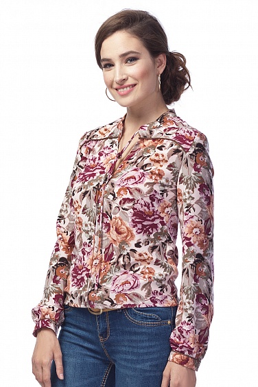 Блузка из мягкой непрозрачной ткани с цветочным принтом и небольшим воротником-стокой. Модель полуприлегающего силуэта с застежкой на пуговицы и небольшими сборками по кокетке, край кокетки и манжет декорирован кантом из искусственной кожи.