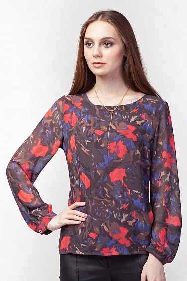 Блузка из шифона средней плотности с принтом. На плотной трикотажной подкладке коричневого цвета в поддержку оттенков принта основной ткани. На спинке застежка напуговицы из натурального перламутра.
