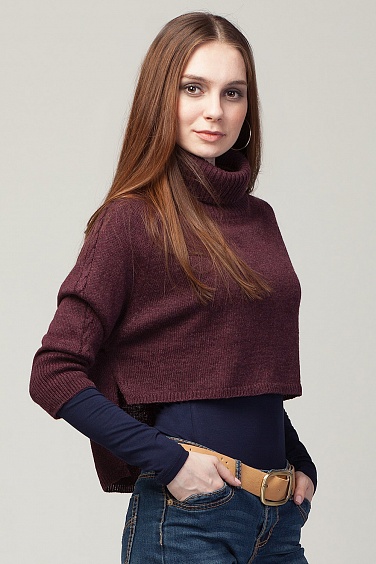 Ультра-модный ассиметричный джемпер мелкой вязки с объёмной горловиной и рукавом реглан. Выполнен из пряжи с высоким содержанием шерсти, деталь переда укорочена, по бокам небольшие декоративные разрезы,на плечах и рукавах декоративная вывязанная "коса".