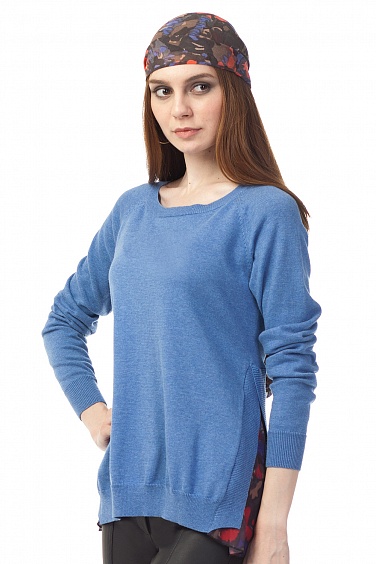 Тонкая хлопковая вязка.Свободный силуэт с высокими боковыми разрезами. Внутри разреза вставка из шифона с принтом, имитирующая наличие блузки внутри - дань актуальному тренду многослойности образа.