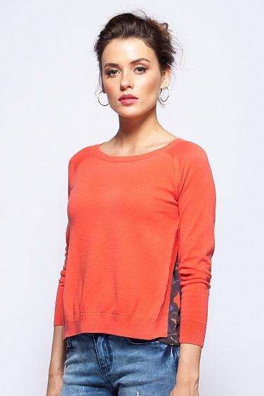 Тонкая хлопковая вязка.Свободный силуэт с высокими боковыми разрезами. Внутри разреза вставка из шифона с принтом, имитирующая наличие блузки внутри - дань актуальному тренду многослойности образа.