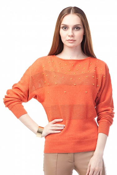 Мягкая вязка средней плотности. Фактура вязки имитирует широкие полосы. Цельнокройный рукав "летучая мышь". Перед украшен бусинами золотистого цвета.