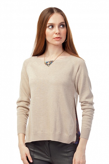 Тонкая хлопковая вязка.Свободный силуэт с высокими боковыми разрезами. Внутри разреза вставка из шифона с принтом, имитирующая наличие блузки внутри - дань актуальному тренду многослойности образа.