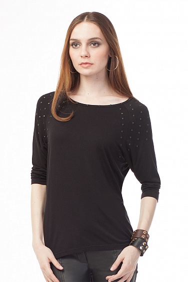 Тонкий джемпер с цельнокроенным рукавом "летучая мышь". Свободный силуэт с заужением к низу. Горловина и проймы украшены клеевыми заклепками черног цвета.