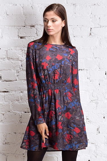 Платье из шифона средней плотности с принтом. На плотной трикотажной подкладке коричневого цвета в поддержку оттенков принта основной ткани. Талия на широкой кокетке, на спинке застежка напуговицы из натурального перламутра.