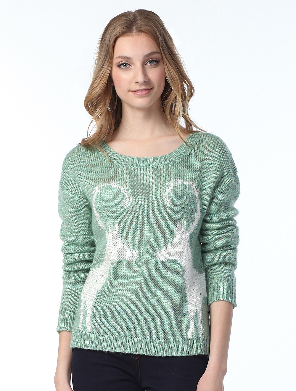 Описание: Крупная вязка меланж из нескольких видов разноцветных нитей в том числе с мохером. Олени вывязаны атласной пряжей с вкраплением перламутровых небольших пайеток, имитирующих снежный блеск.