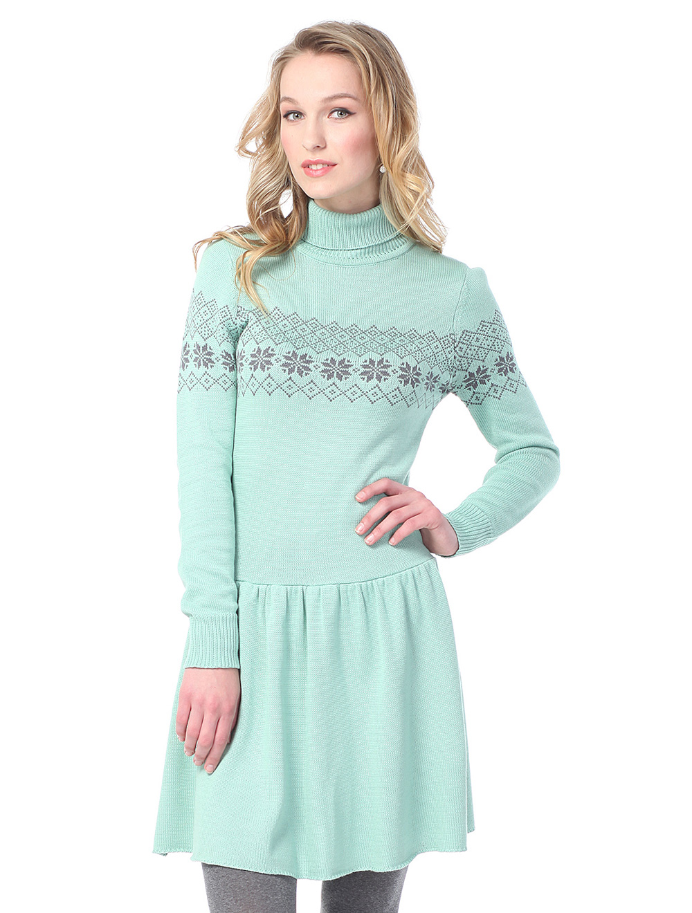 Описание: Мягкая вязка средней плотности. Высокая горловина. Заниженная линия талии и пышная юбка на легкой сборке. В больших размерах изделие по колено.