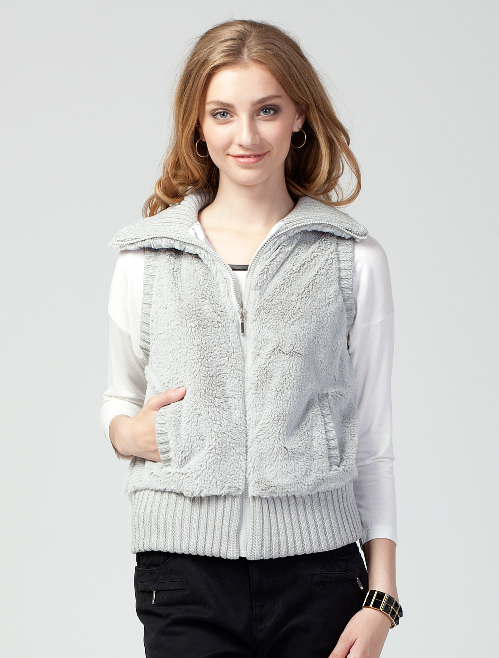 Описание: Жилет из мягкого иск меха. Подвязы крупной вязки из хлопка. Подкладка из атласной ткани. Застежка на молнию.