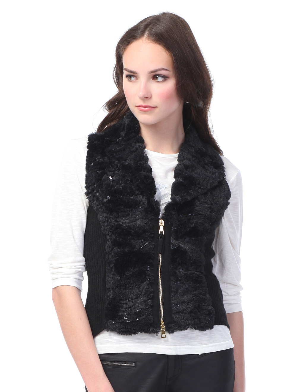 Описание: Жилет выполнен крупной вязкой-резинкой 1*1. Перед из короткого иск меха, украшенного вышивкой из матовых черных пайеток, придающих легкое и случайное мерцание меху. Застежка на двусторонюю металлическую молнию золотистого цвета.