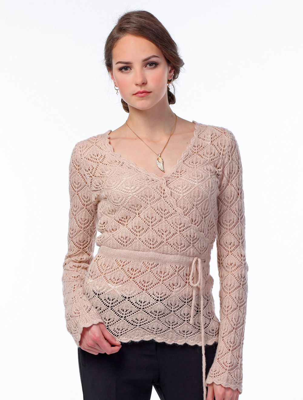 Описание: Пушистая и легкая пряжа с мохером. Ажурная и фактурная вязка. Линия талии на кулиске с тонким пояском, завязывающимся сбоку.