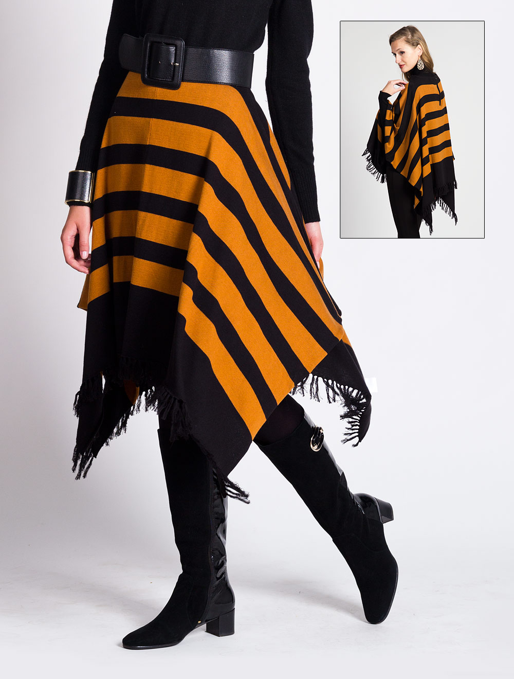 Описание: Вязаная юбка с бохромой по низу выполнена в виде прямоугольлника, что при носке создает эффект провисания углов и ассиметричность низа. Сзади застежка на молнию.
