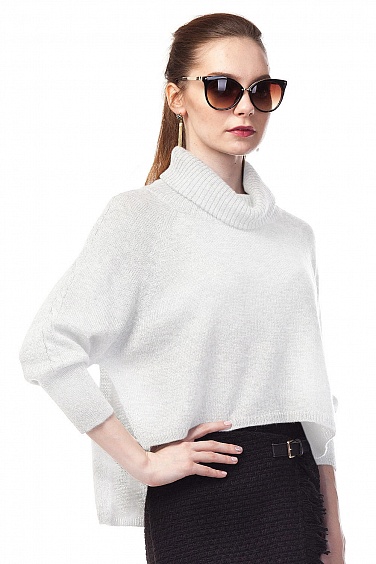 Ультра-модный ассиметричный джемпер мелкой вязки с объёмной горловиной и рукавом реглан. Выполнен из пряжи с высоким содержанием шерсти, деталь переда укорочена, по бокам небольшие декоративные разрезы,на плечах и рукавах декоративная вывязанная "коса".