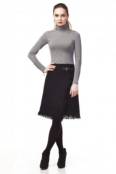 Тёплая юбка ассиметричного А-образного силуэта актуальной длины "миди" с запахом. Изделие выполнено из фактурной ткани, низ и передний кант декорированы бахромой из основной пряжи. В левой части регулируемая застёжка из искусственной кожи.