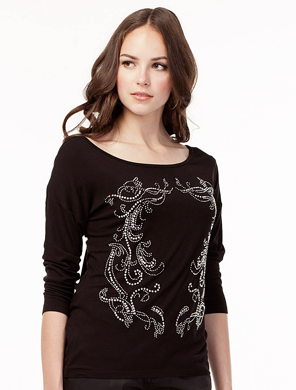 Описание: Мягкий пластичный вискозный трикотаж, спереди джемпер украшен металлического цвета стразами в виде растительного узора.