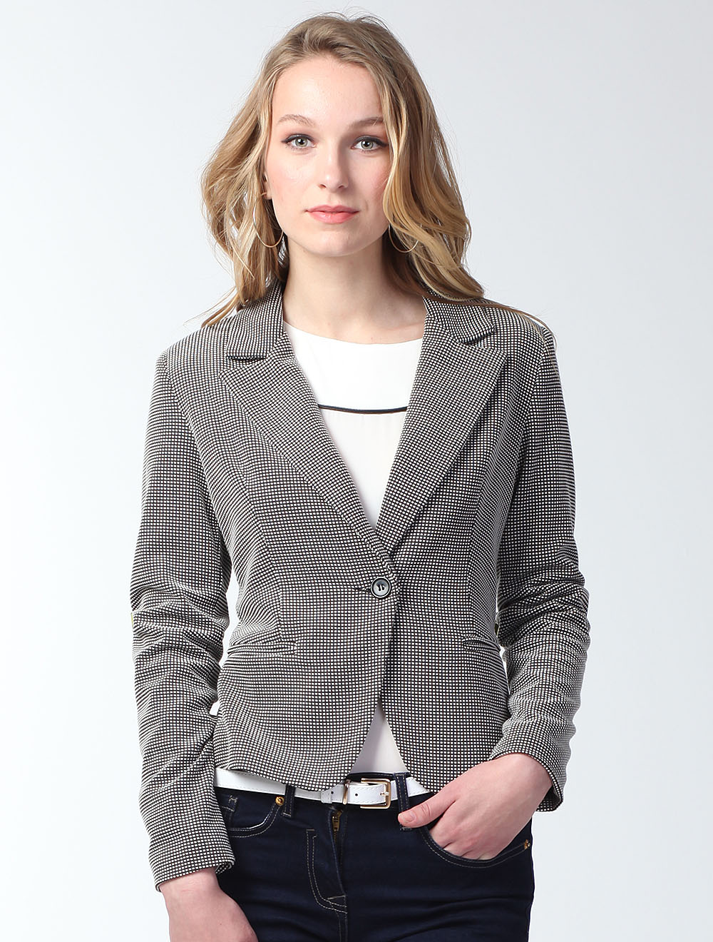 Описание: Жакет выполнен из плотного трикотажного полотна с фактурным черно-белым переплетением. Тонкая трикотажная же подкладка создает дополнительный комфорт в носке. Силуэт минималистичный и приталенный.