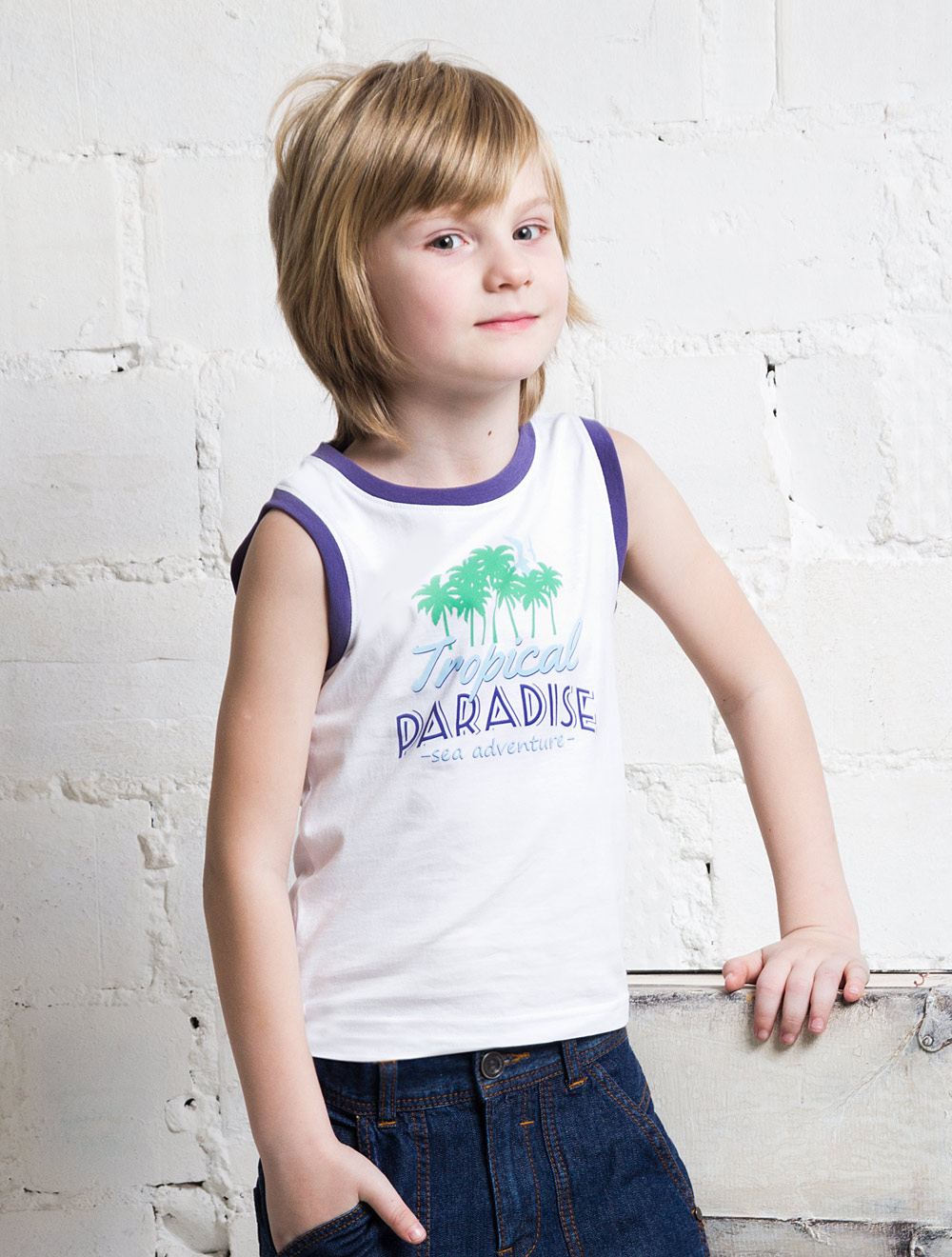 Описание: Майка с принтом на тропическую тему. Контрастная окантовка горловины и пройм