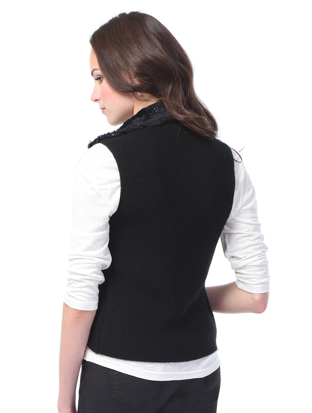Описание: Жилет выполнен крупной вязкой-резинкой 1*1. Перед из короткого иск меха, украшенного вышивкой из матовых черных пайеток, придающих легкое и случайное мерцание меху. Застежка на двусторонюю металлическую молнию золотистого цвета.