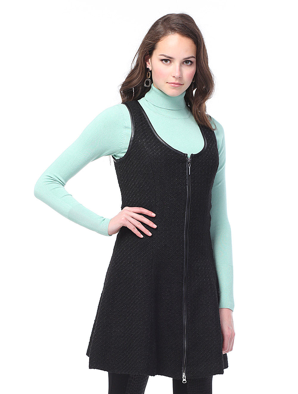 Описание: Жакетная и плотная ткань в стиле "шанель" с небольшими вкраплениями черного люрекса. Проймы и горловины окантованы иск кожей, застежка спереди на двусторонюю металлическую молнию блестящего т. серебряного цвета. В больших размерах длина за колено