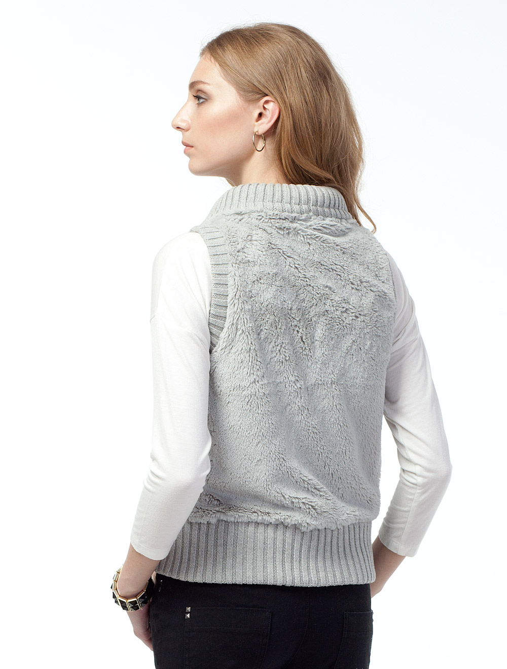 Описание: Жилет из мягкого иск меха. Подвязы крупной вязки из хлопка. Подкладка из атласной ткани. Застежка на молнию.
