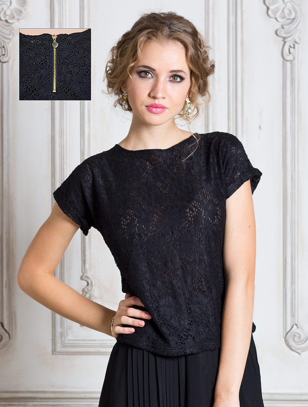 Описание: Блузка из трикотажного кружева на подкладке. Сзади от горловины декоративная металлическая молиня.