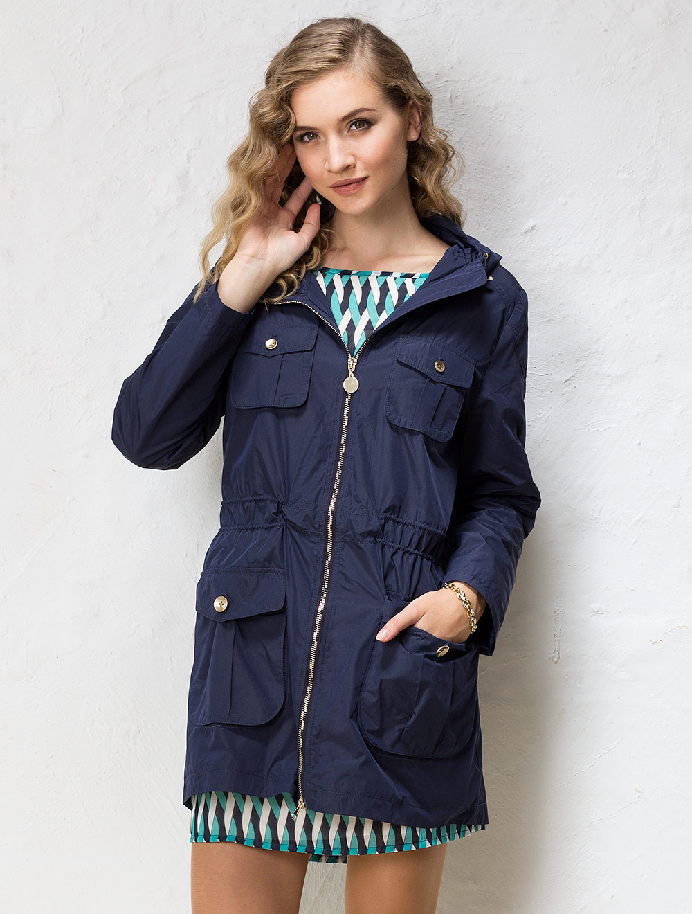 Описание: Синтетическая ткань с плотным плетением и легким двуцветным отливом (между т.синим и черным). Эффектная фурнитура золотистого цвета. Застежка на металлическую молнию. Капюшон с кулиской и регуляторами. Л.талии регулируется резинками в кулиске на стопорах изнутри куртки. Сзади внизу эффектный разрез. Декоративные строчки выполнены толстыми нитками.