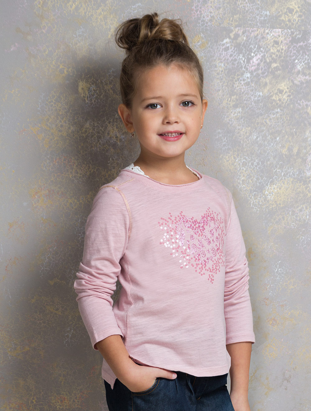 Описание: Футболка из фактурного хлопкового трикотажа, декорированная принтом, пайетками и кружевом.
