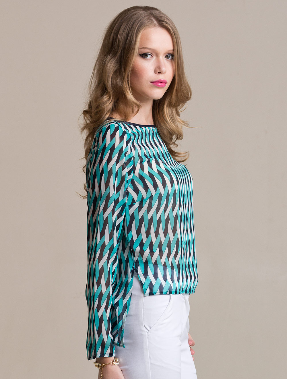Описание: Выполнено из шифона, прозрачность которого компенсируется пестрым графичным рисунком. Силуэт прямой, укороченный спереди и удлиненный сзади. Горловина окантована иск. кожей т.синего цвета.