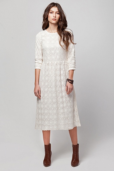 Платье женское самого актуального в этом сезоне стиля "бохо" и 70-х. Силуэт со свободной слегка завышенной талией и небольшой сборкой юбки. Выполнено из кружева на подкладке из трикотажного хлопка. Застежка на потайную молнию в боковом шве. Сзади вырез капля с застёжкой на пуговицу, рукава 3/4, на манжетах на пуговице. Как и стиль 70-х, миди-длина является значимым трендом этого сезона.