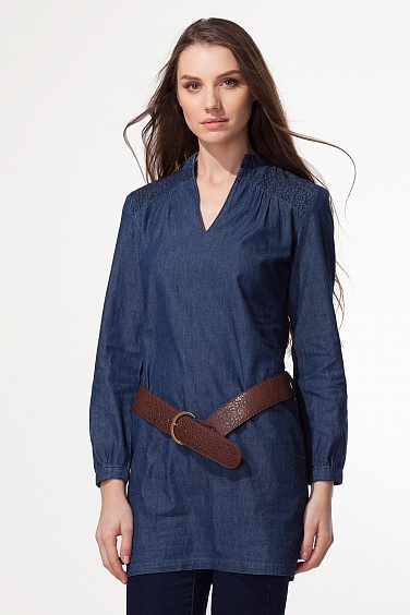 Актуальное платье-рубашка в стиле 70-х из тонкой джинсовой ткани с воротником стойкой. Сборки под кокеткой и узкие манжеты со сборкой на рукавах. Акцент этой модели - фактурная вышивка на плечах.