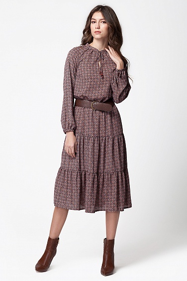 Платье женское из плотного искусственного крепового шелка на подкладке. Небольшой воротник-стойка завязывается на веревочки с бусинами на концах. Талия на резинке, юбка состоит из трех воланов со сборками для придания объема. Рукава присборены на узкой манжете с застежкой на пуговицу.