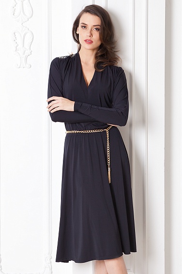 Макси платье из трикотажного полотна с глубоким V-образным вырезом на груди. Длинный цельнокроеный рукав, на плечах декор из золотых фигурных страз в виде эполет, линия талии на эластичной тесьме, юбка "полусолнце" пояс - массивная золотая цепочка с эффектным наконечником.