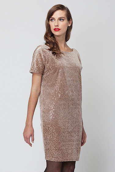 Платье из трикотажного бархатного полотна, расшитого пайетками в тон ткани. Пайетки нашиты волнистым узором. Рукав цельнокроеный. Сверху платье свободно, с большим объемом, нижняя часть плотно прилегает по бедрам. В больших размерах длина платья до середины колена.