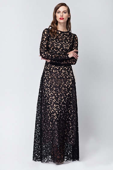Кружевное вечернее платье на подкладке, с приталенным лифом и расширенной к низу юбкой. Подкладка бежевого цвета создает эффектный женственный образ. Застежка на спине на потайную молнию