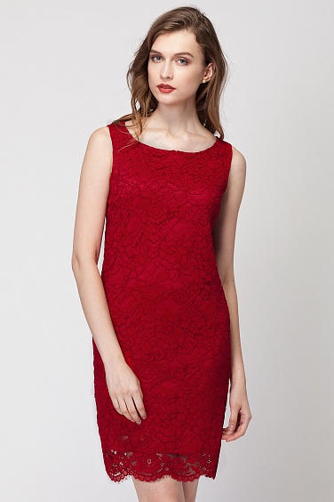 Классическое платье прямого силуэта из кружева с цветочным узором на подкладке. Каплевидный вырез на спине, застежка на пуговицу.