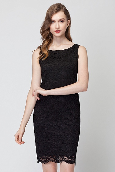 Классическое платье прямого силуэта из кружева с цветочным узором на подкладке. Каплевидный вырез на спине, застежка на пуговицу.