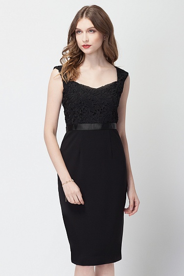 Приталенное женственное платье удлиненного силуэта на подкладке. Лиф платья декорирован кружевом. Сбоку потайная молния