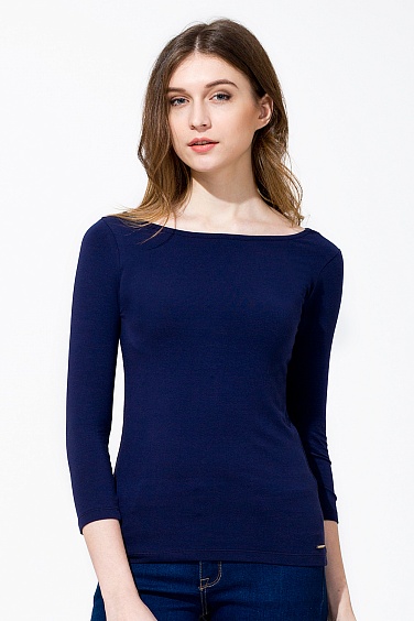 Базовая плотно прилегающая женская футболка. Вырез - лодочка, рукава 3/4. Низ изделия украшен золотистым логотипом.