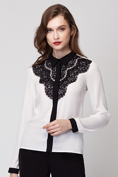 Блузка классического покроя, но с оригинальной кружевной кокеткой спереди. Спереди потайная застежка на планке. Воротник, планка и манжеты выполнены из контрастной ткани.