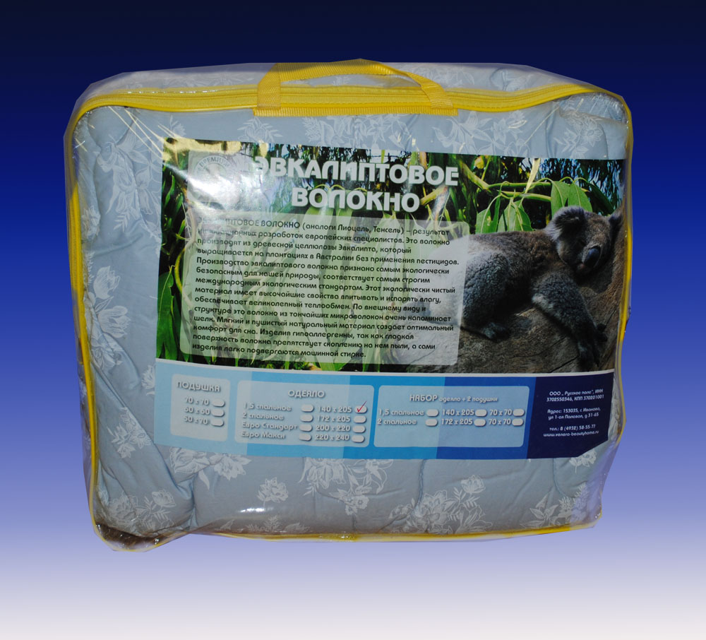 Экологически чистый, высококачественный материал, имеет свойства впитывать и испарять влагу, обеспечивает хороший теплообмен. Изделия с наполнителем эвкалиптовое термополотно гипоаллергенны и не скапливают пыль.