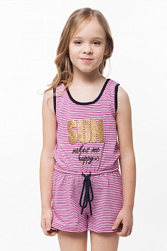 Комбинезон для девочки с застежкой на кнопки на плече. Декорирован принтом с глиттером на груди. Шнурок на талии позволяет регулировать объем.