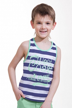Майка-борцовка для мальчика из хлопкового полотна с принтованной полосой. Спереди декорирована принтом. Горловина и проймы обрботаны бейкой в цвет принта.